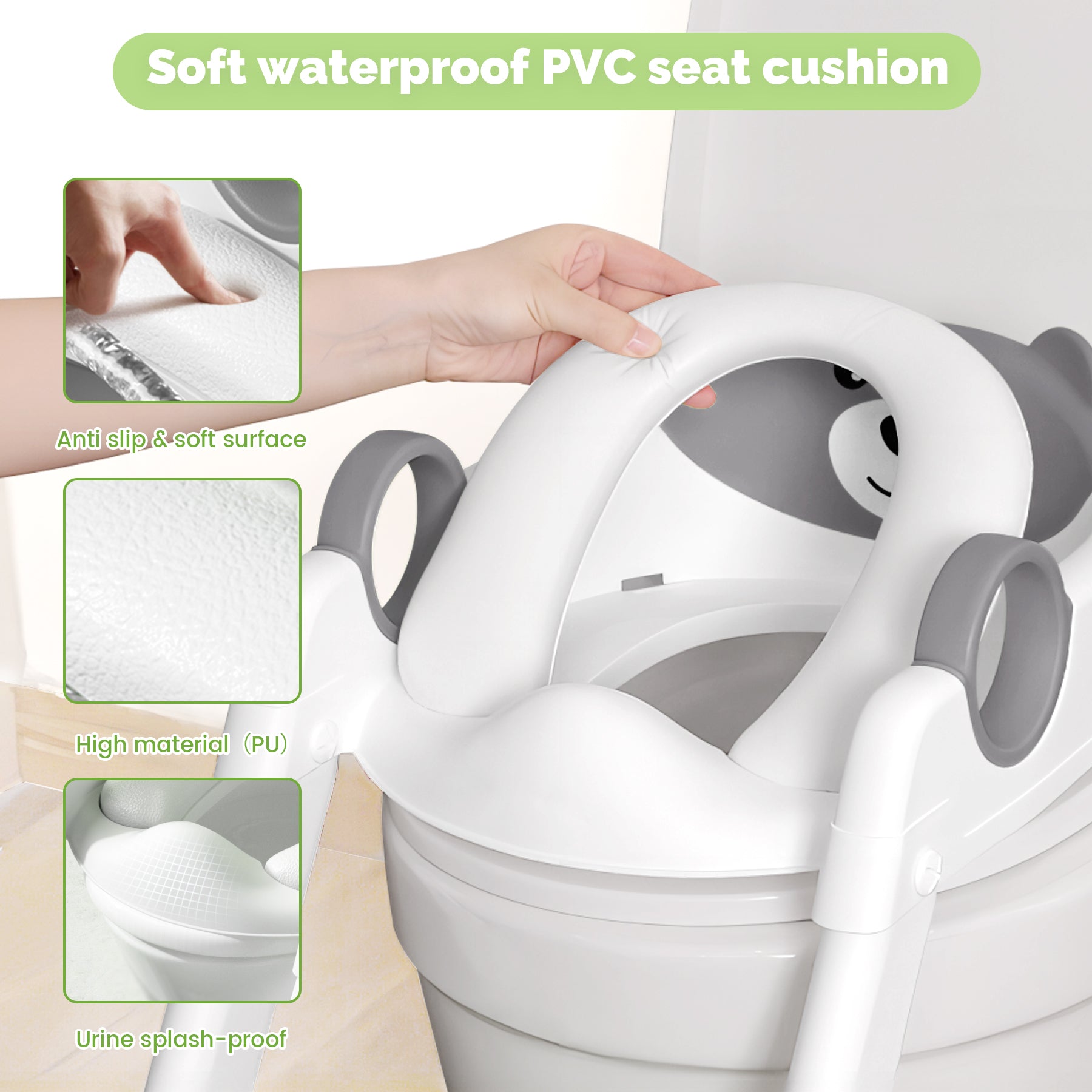 - 🧸【SOFT CUSHION】Our potty seat for toddlers with step stool comes with a waterproof PVC seat cushion that feels soft to the touch, providing protection for children's sensitive skin. It also stays comfortable to use during the winter months without feeling cold.