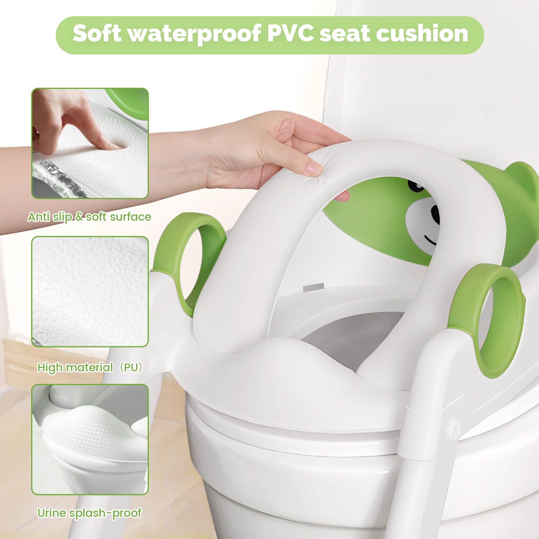 - 🧸【Soft Cushion】Our potty seat for toddlers with step stool comes with a waterproof PVC seat cushion that feels soft to the touch, providing protection for children's sensitive skin. It also stays comfortable to use during the winter months without feeling cold.