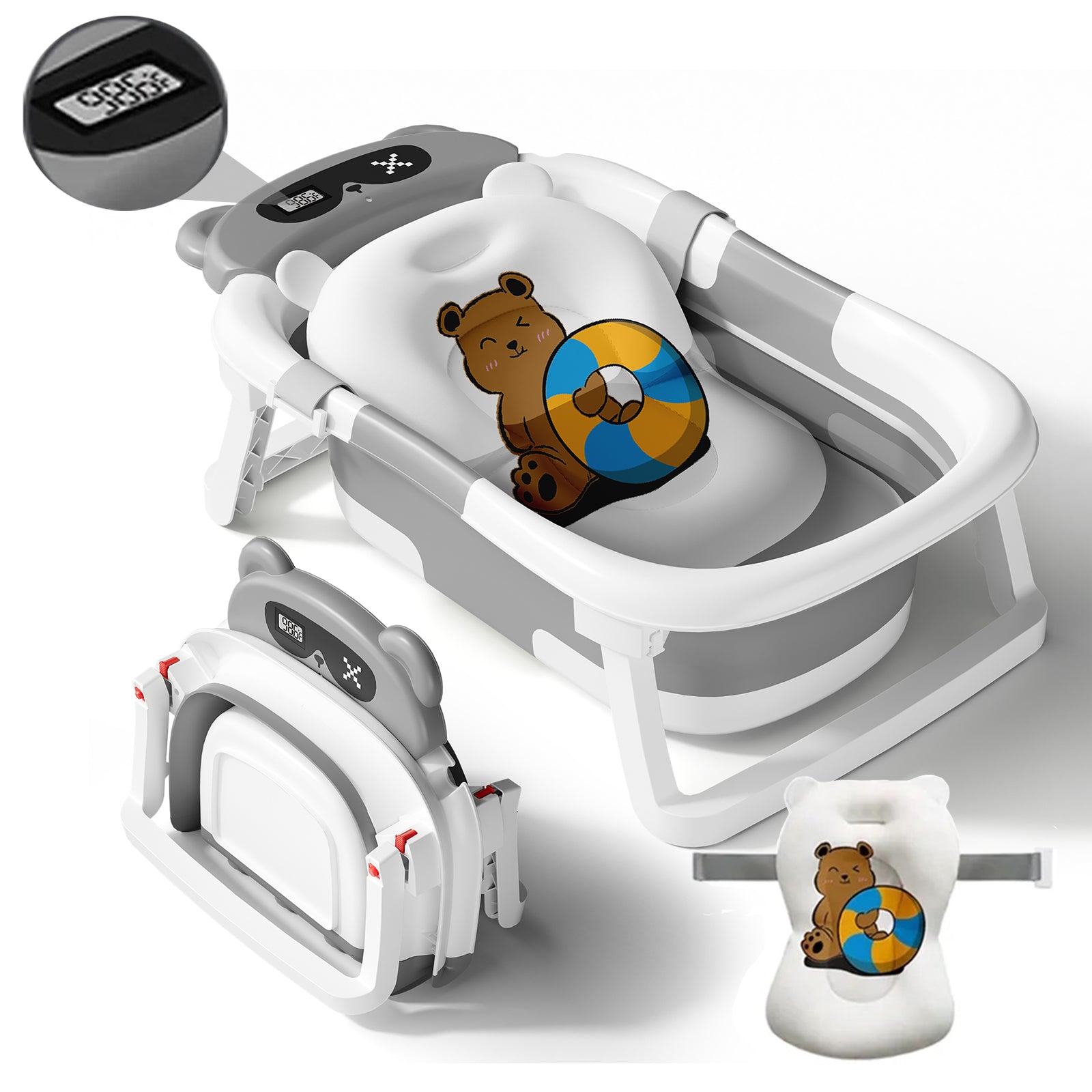Collapsible Baby Bathtub for Infants, Bath Tub with Cushion and Thermometer, for Newborn to Toddler Portable Travel Multifunctional Bathing 0-2 years (Bear/Gray)