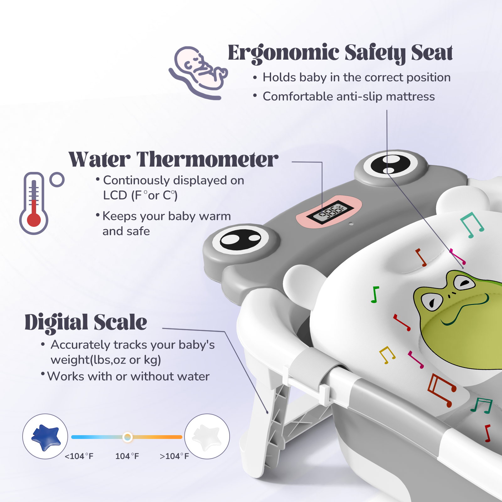 Cartoon frog bathtub is specially designed for babies, featuring high-quality and safe materials that allow parents to use it with complete confidence. Our bathtub is equipped with a thermometer function, eliminating the concern of mothers that the baby might catch a cold. It is suitable for babies aged 0-2 years old in size(8”x 25” x 16.5”), accompanying the baby's growth gradually. While, when you are not using it, you can fold it and store it in any corner. It is always working to improve its products to provide better quality and service. Right now, our main goal is to help parents reduce stress while raising children and support children in growing faster and healthier. We're grateful for the strong support from our customers and sincerely appreciate everyone's recognition and partnership. We are committed to ongoing improvement and growth.