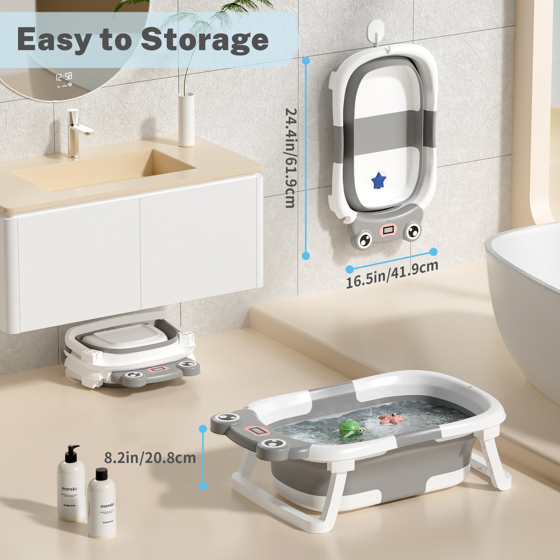 Collapsible Baby Bathtub for Infants, Bath Tub with Cushion and Thermometer, for Newborn to Toddler Portable Travel Multifunctional Bathing 0-2 years (Frog/Gray)