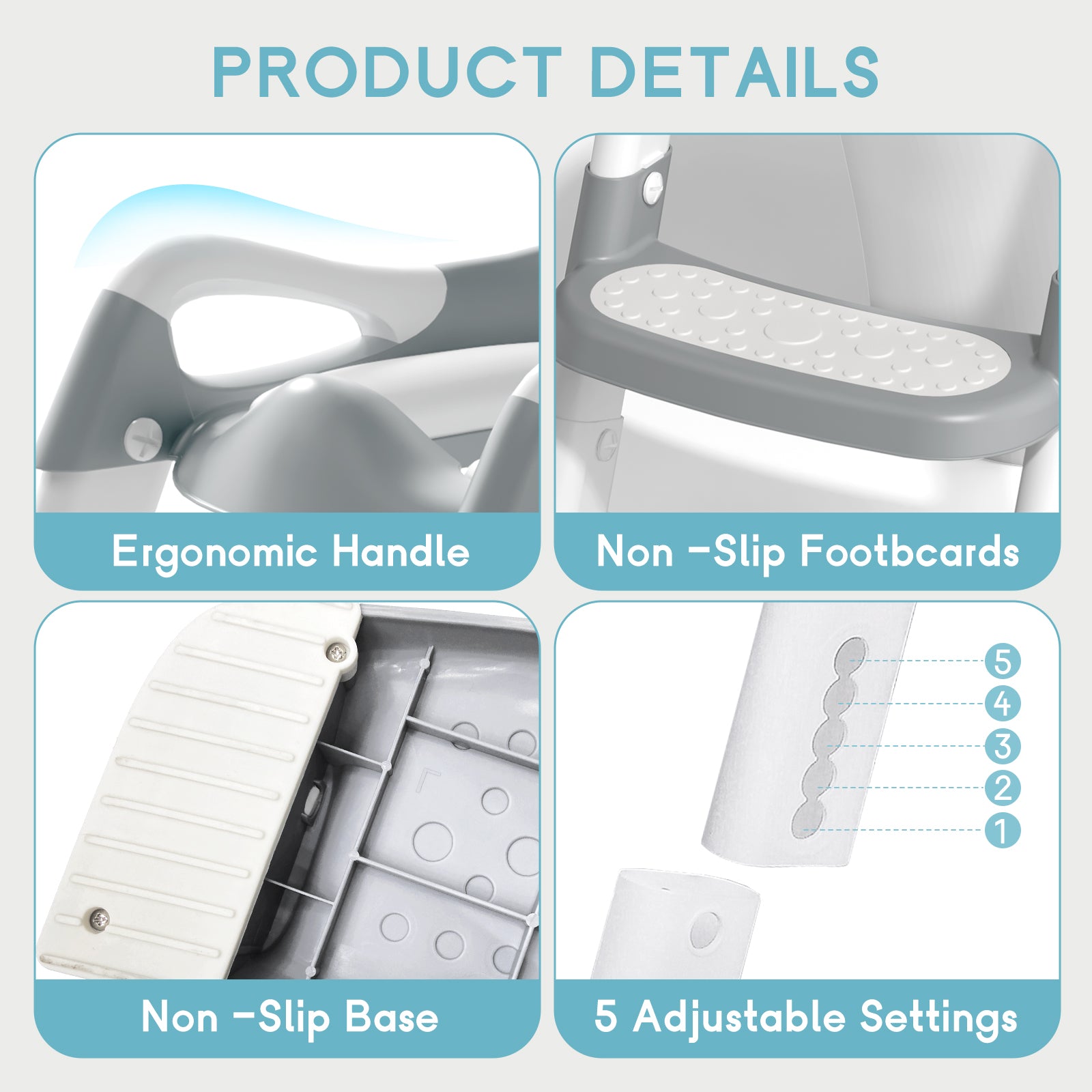 - 【Anti-Slip Design】The TPE non -slip glue pads are installed on both sides of the bottom of the pedal on the toddler toilet seat, which can enhance the grip.A suction cups and non -slip strips are installed under the seat to prevent the seat from shift. The pattern on the soft rubber pedal can increase friction and more comfortable,combined with the handles on both sides of the potty training toilet, your child can climb more safely