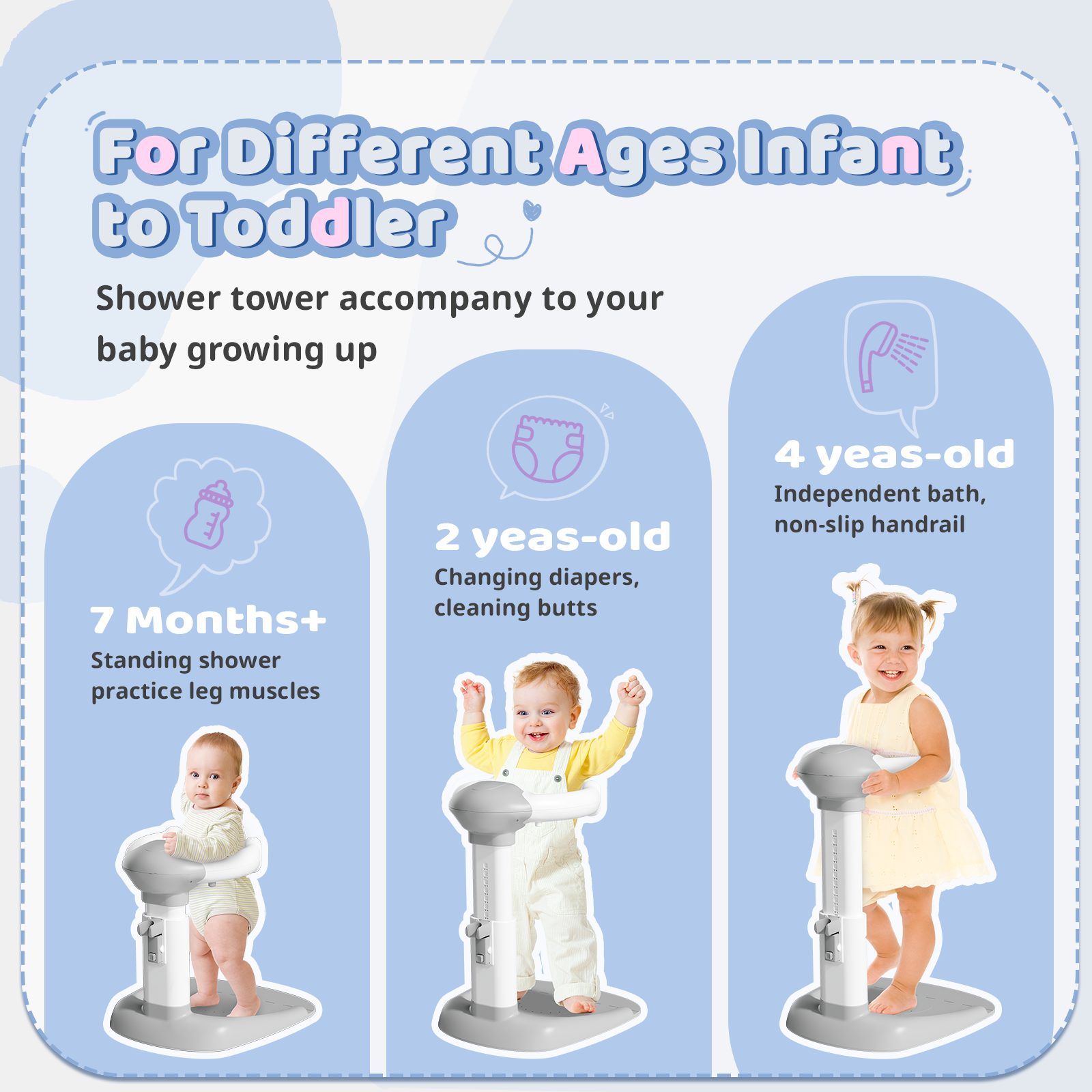 • 【MULTI-APPLICATION USAGE】 The adjustable handle securely assists in cleaning your baby's hips or changing their diaper while they stand safely. This shower standing tower is versatile and can be used in various locations, including the bathroom for baby baths, diaper changes, and applying lotion and cream.